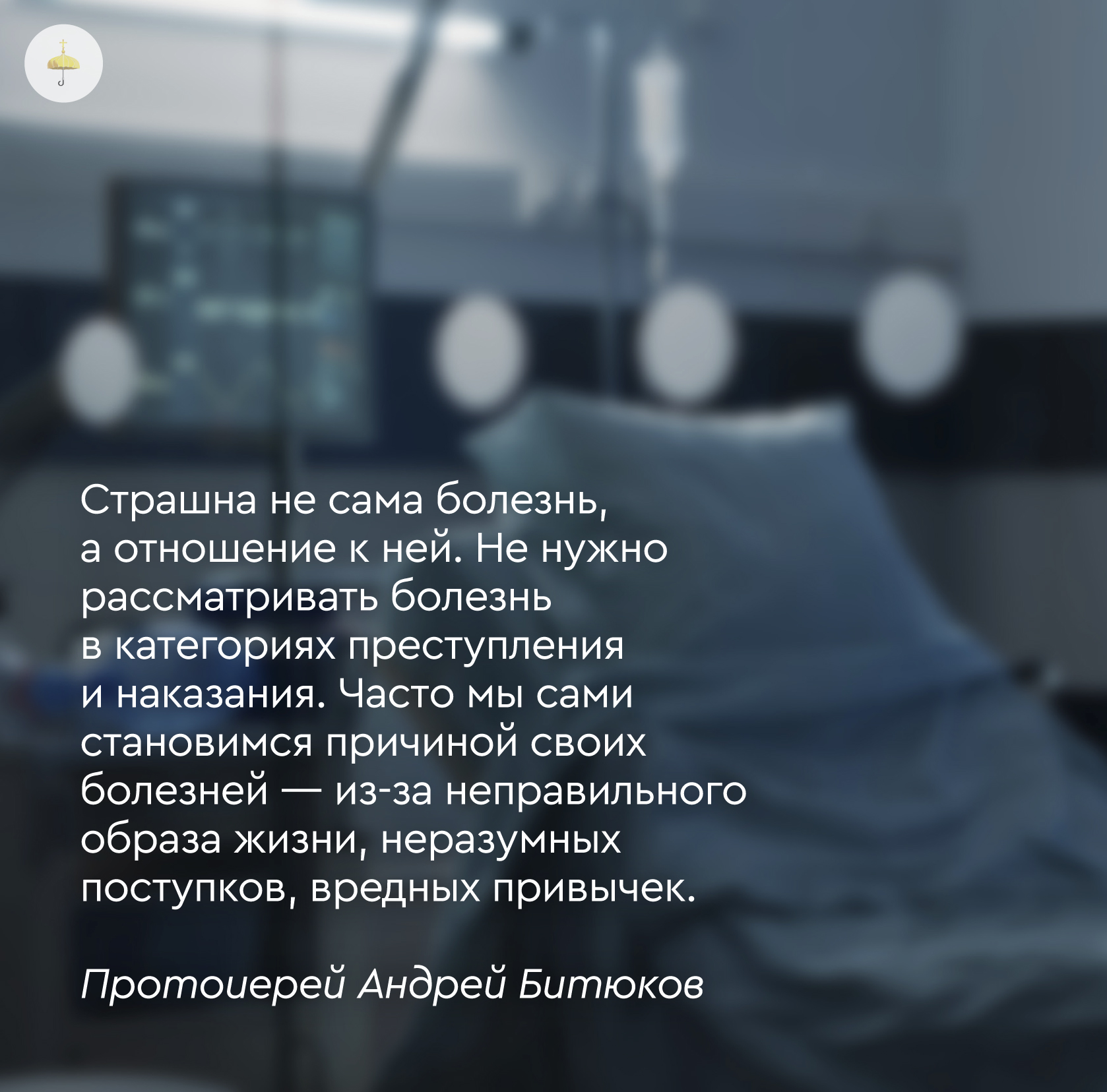 Страшна не сама болезнь, а отношение человека к ней. Никогда не нужно рассматривать болезнь в категориях преступления и наказания. Очень часто мы сами становимся причиной своих болезней — из-за неправильного образа жизни, неразумных поступков, вредных привычек.