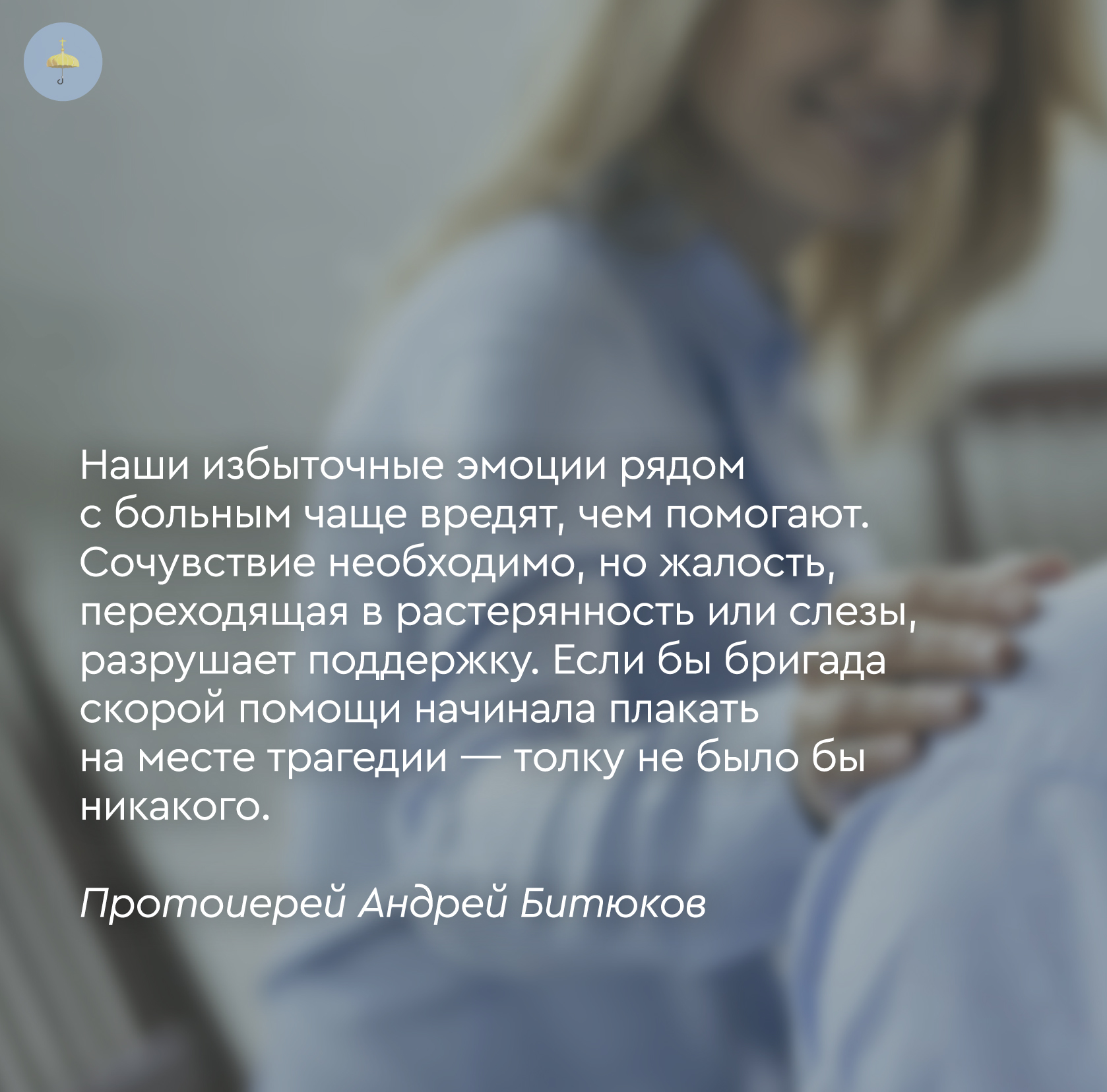 Я работал на скорой помощи, и эта работа меня многому научила: наши избыточные эмоции рядом с больным чаще вредят, чем помогают. Сочувствие необходимо, но жалость, переходящая в растерянность или слезы, разрушает поддержку. Если бы бригада скорой помощи начинала плакать на месте трагедии — толку не было бы никакого.