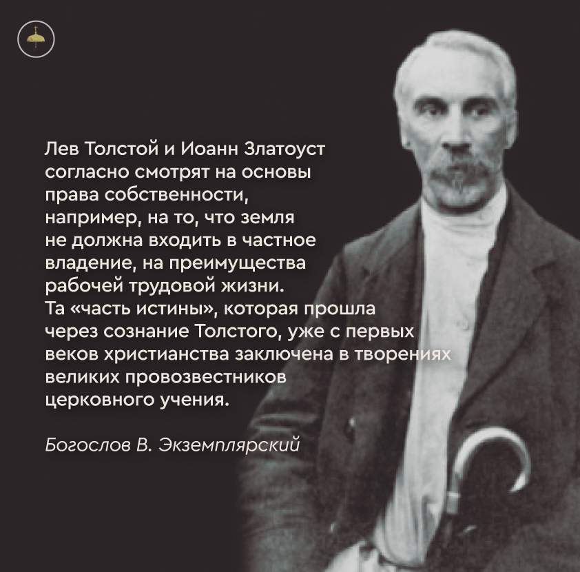 В очерке «Гр. Л. Н. Толстой и св. Иоанн Златоуст в их взгляде на жизненное значение заповедей Христовых», написанном всего спустя год после смерти Толстого, в 1911 г., профессор Киевской духовной академии (уволенный из нее как раз из-за этого очерка — через шесть лет его восстановят), выдающийся богослов Василий Экземплярский ясно показывает, что социально-экономическое учение Толстого православно — оно просто-напросто совпадает с социально-экономическим учением святителя Иоанна Златоуста, то есть с социально-экономическим учением Православной Церкви (коль скоро ее учение есть учение Отцов Церкви). Этот очерк — до сих пор образец того как надо вести подобные споры: вместо того, чтобы подчиняться ходячим толкам, общим местам, бездумным автоматизмам кажущихся очевидных мнений, — нужно внимательно читать: вместо того, чтобы раз за разом воспроизводить кажущееся очевидным противопоставление православия и толстовства, стоило бы задаться вопросом по существу, в чем собственно, то и другое состоит — и не «вообще», а конкретным вопросам. И вместо того, чтобы изобличить Толстого, можно было бы — самому Толстому и толстовцам — продемонстрировать на конкретных текстах, что его учение в существенной доле — (бессознательно) православно, бессознательно вторит Отцам Церкви. Цитаты:
