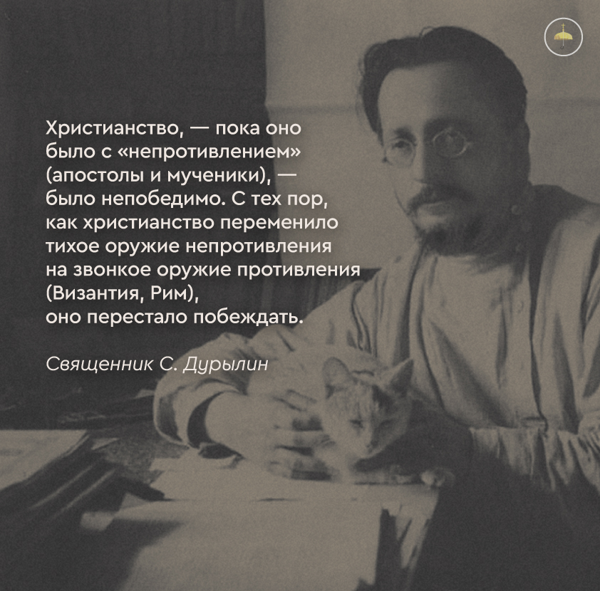 Священник Сергей Дурылин, духовное чадо преподобного Анатолия Оптинского, яркий представитель русской культуры пер. пол. XX в., мыслитель, выдающийся литературовед, был лично знаком с Толстым и относился к его учению критически. В 1920 г. — в начале советских гонений на Церковь он становится священником (по благословлению преподобного Анатолия Оптинского и праведного Алексия Мечева). Опыт гонений, опыт разгара небывалого насилия меняет отношение Дурылина к толстовству — и именно как православного священника. Обратим на это внимание: здесь (как и в нескольких примерах ниже) мы видим пример позитивной переоценки учения Толстого в силу пережитого опыта кошмара повсеместного насилия (к 1920 г. — на судьбу России уже выпали: русско-японская война, Первая русская революция, Первая мировой война, репрессии и погромы, революционный процесс 1917 г. и начавшаяся Гражданская война, репрессии, осуществлявшиеся всеми ее сторонами). Непротивление злу силою — его ценность, истинность постигается именно изнутри торжества зла. Оно и понятно. В ситуации безопасности легко предаваться мечтаниям о героической силовом победном торжестве над злом. Не так в ситуации тожества зла, когда просто нет никакой возможности противостоять злу силою, но какое-то противление остро нужно. Но ведь это — потрясающей верно подмечает, казалось бы, очевидный, но столь часто упускаемый момент Дурылин — ситуация первых трех веков христианства. Имя Толстого в его тексте собственно не упоминается (но упоминается имена основателей толстовской коммуны), но в центре — «непротивление», то есть то именно, что было в центре социальной философии Толстого. Просто-напросто исповеднеческий и мученический опыт есть опыта именно непротивления злу силою. Просто-напросто в ситуации бессилия не остается ничего кроме непротивления злу силою — поскольку «силы» никакой не остается. Текст маленький, приведем его полностью (обратите внимание на дату написания: 1928 г., т. е. Дурылин пишет этот текст после первого ареста — где он оказывается в одной камере с священномучеником Фаддеем (Успенским) и священноисповедником Афанасием (Сахаровым) — и высылки в 1922 г., сразу после второго ареста в 1927 г., получается, во второй своей высылке — пишет, запечатляя непосредственно переживаемый им исповедчнический опыт Православной церкви тех лет):