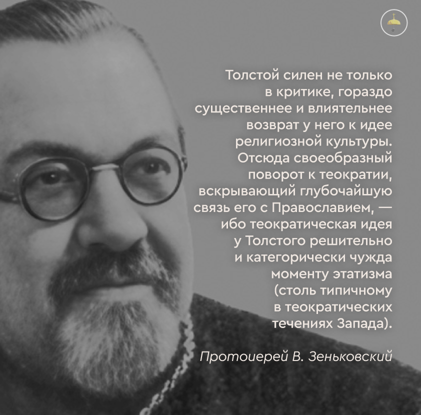 «Значение Толстого в истории русской мысли все же огромно. Самые крайности его мысли, его максимализм и одностороннее подчинение всей жизни отвлеченному моральному началу довели до предела одну из основных и определяющих стихий русской мысли. Построения толстовского «панморализма» образуют некий предел, перейти за который уже невозможно, но, вместе с тем, то, что внес Толстой в русскую (и не только русскую) мысль, останется в ней навсегда. Этический пересмотр системы секулярной культуры изнутри вдохновляется у него подлинно–христианским переживанием; не веря в Божество Христа, Толстой следует Ему, как Богу. Но Толстой силен не только в критике, в отвержении всяческого секуляризма, гораздо существеннее и влиятельнее возврат у него к идее религиозной культуры, имеющей дать синтез исторической стихии и вечной правды, раскрыть в земной жизни Царство Божие. Отсюда принципиальный антиисторизм Толстого, своеобразный поворот к теократии, вскрывающий глубочайшую связь его с Православием, — ибо теократическая идея у Толстого решительно и категорически чужда моменту этатизма (столь типичному в теократических течениях Запада). Толстой отвергал Церковь в ее исторической действительности, но он только Церкви и искал, искал «явленного» Царства Божия, Богочеловеческого единства вечного и временного.