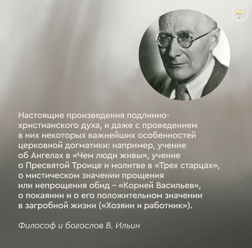 Но и дальше такие среднего или мелкого размера произведения, как «Хозяин и работник», «Корней Васильев», «Чем люди живы», «Три старца» и др., представляют в своем роде литературно-идеологическое совершенство. К тому же это настоящие произведения подлинно-христианского духа, и даже с проведением в них некоторых важнейших особенностей церковной догматики: например, учение об Ангелах в «Чем люди живы», учение о Пресвятой Троице и молитве в «Трех старцах», о мистическом значении прощения или непрощения обид – «Корней Васильев», о покаянии и о его положительном значении в загробной жизни («Хозяин и работник»). Всесторонняя доброкачественность этих безупречно христианских произведений как бы гарантируется восторженным отзывом о них сурового византийского церковника и превосходнейшего, совсем еще не оцененного стилиста Константина Леонтьева. (Этюд под заглавием «Анализ, стиль и веяние»)».