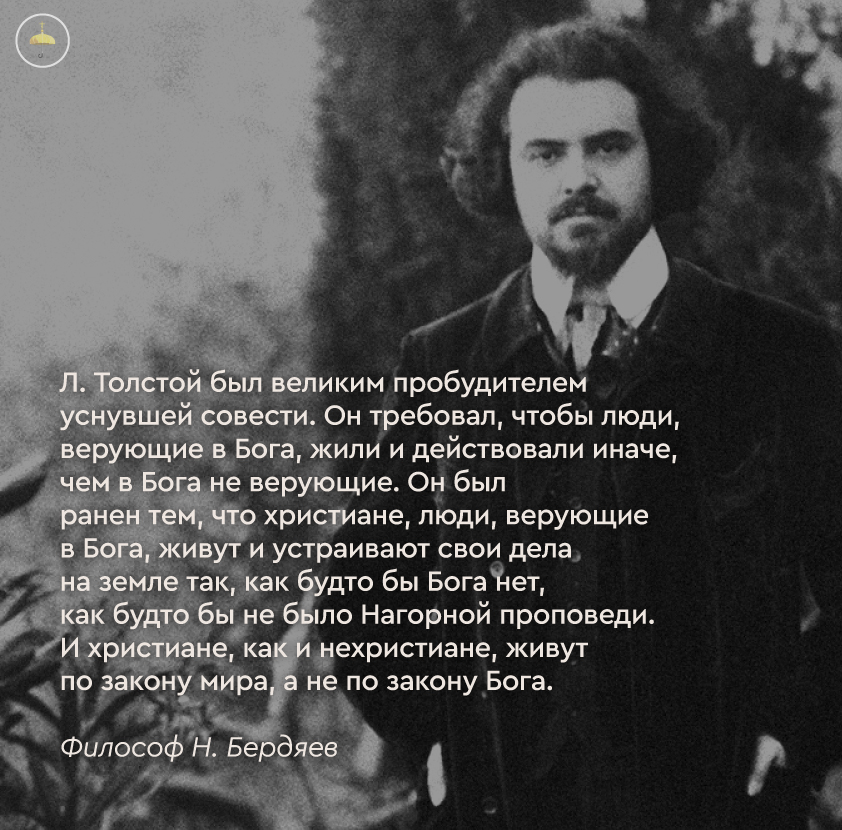 Николай Бердяев, великий русский религиозный философ, классик мировой философии XX в., много писал о Толстом, притом преимущественно критически. Однако в зрелом, позднем творчестве — очевидно, после кошмарного исторического опыта революционного и реакционного насилия, тоталитаризмов, мировых и гражданских войн пер. пол. XX в. — он предлагает иное понимание мысли Льва Толстого — критически-позитивное.