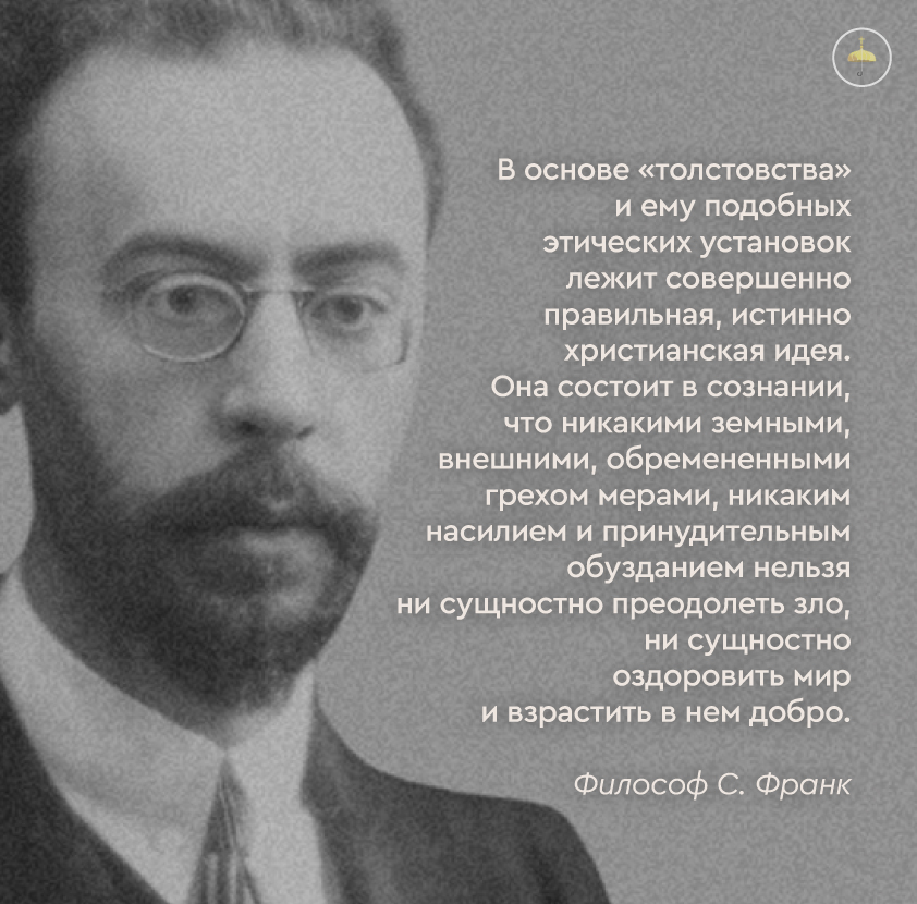 Толстовство, пишет Франк, истинно, верно в своем ядре (не в своих грубых попытках богословствования, конечно) — в задаче сущностного преодоления зла. Толстовство тем самым на том уровне, где его и надо расположить — уровне христианской мистики, аскетики, этики («духовного совершенствования», расцвета и сияния добра) — есть просто-напросто базовая христианская позиция: добро в собственном смысле слова, благодатность, обоженность есть именно что чистое добро (толстовство — нечто вроде моральной тавтологии: добро есть добро; «добро божественно» по Витгенштейну), не зло, не грех, то есть в частности — не насилие: добро есть не-насилие, оно не-насильственно по определению. Нагорная проповедь и фиксирует эту моральную математику: «подставить другую щеку» и пр. нужно, чтобы не прибавлять насилие к насилию, зло к злу, не плодить греха (т. е. даже в худшем случае =/> морально-бытийный ноль: не создается нового зла; не отвечать ударом на удар, не воздавать злу злом), что уже в самом своем акте есть расцвет добра, сияние божественности, этическое чудо и красота, новый образ поведения (= морально-бытийный плюс, новое благое бытие: отдать и рубашку, пройти и лишнее поприще; красота и добро смирения и кротости; то есть не только не создавать новое зло в ответ на причиненное тебе, но создать в ответ новое добро). Итак, если вообще благодатные силы, силы подлинного добра действуют в реальности, то действуют они добро, не-насильственно. Бог действенно добр, действенно не-насильственен: Божественное (т. е. абсолютно доброе) всемогущество осуществляется абсолютно не-насильственно, что вполне мыслимо, коль скоро речь идет именно о всемогуществе (Бердяев где-то совершенно справедливо замечает слишком часто пропускаемое христианским сознанием: именно всемогущество Бога позволяет Ему не прибегать к насилию и творить Свою волю только благими средствами, образами, путями. Он всемогущ, то есть может так, что — с точки зрения мира насилия — означает Его бессильность, немощность = всемогущую не-насильстенность; психологический и политологический трюизм: к насилию прибегают от нездоровья, от морального бессилия, от скудости творческих сил и средств; конечно, об Абсолюте говорить так было бы нелепо).
