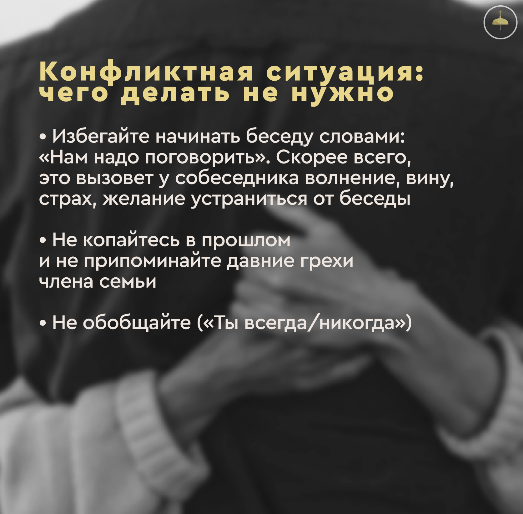 | Не копайтесь в прошлом и не припоминайте давние грехи члена семьи | Концентрируйте внимание на отношениях в настоящем. У вас наверняка есть масса неразрешенных проблем, и при разговоре может возникнуть соблазн все их разворошить |