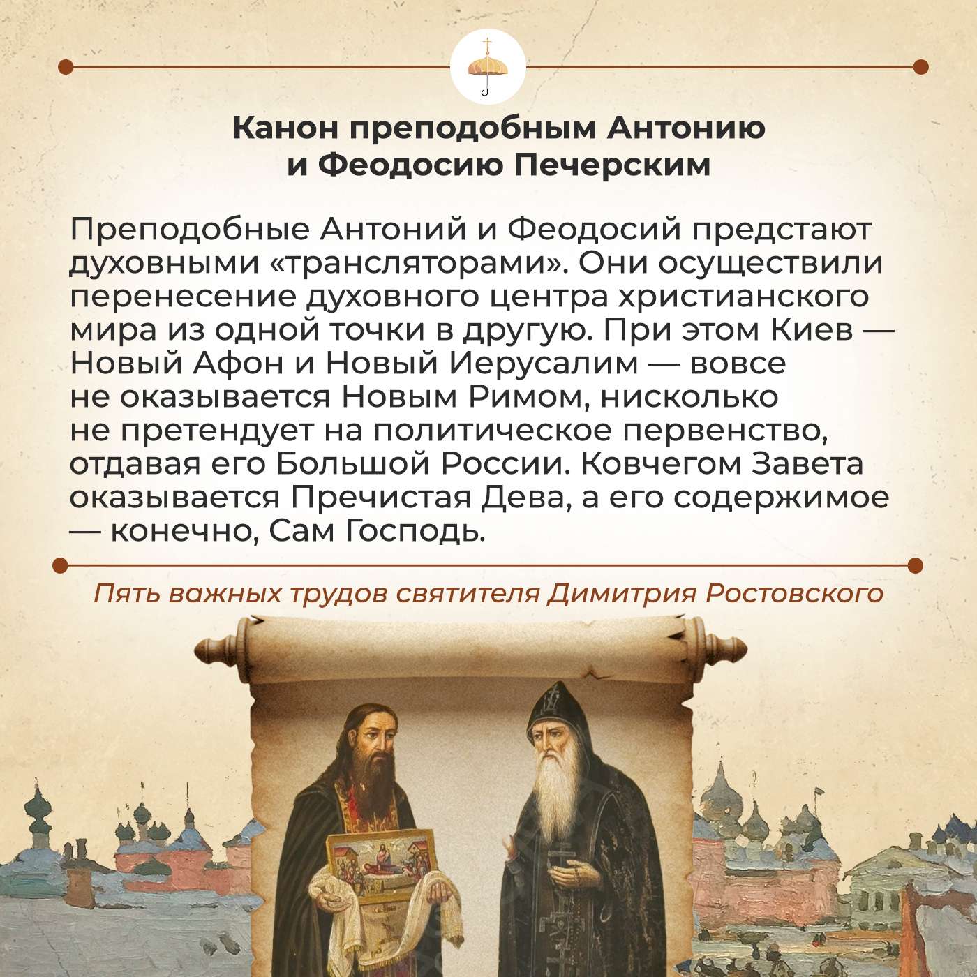 В 1703 году — это мы тоже знаем из сопроводительного письма — богатый гражданин, за счет которого и строился храм, И. Ф. Протодьяконов, обратился к владыке с просьбой составить поэтический текст в честь киевских святых. «Вследствие этого прошения и был прислан в Устюг св. Димитрием означенный канон, — нарочно ли тогда составленный, или заранее сочиненный, неизвестно». На 150 лет канон отправился на полку епархиального архива — о нем до публикации в «Христианском чтении» в 1859 году не знали ни справочники, ни исследователи. А ведь помимо того, что это очень красивый, образно насыщенный текст, «Канон Антонию и Феодосию» — важный идеологический памятник.