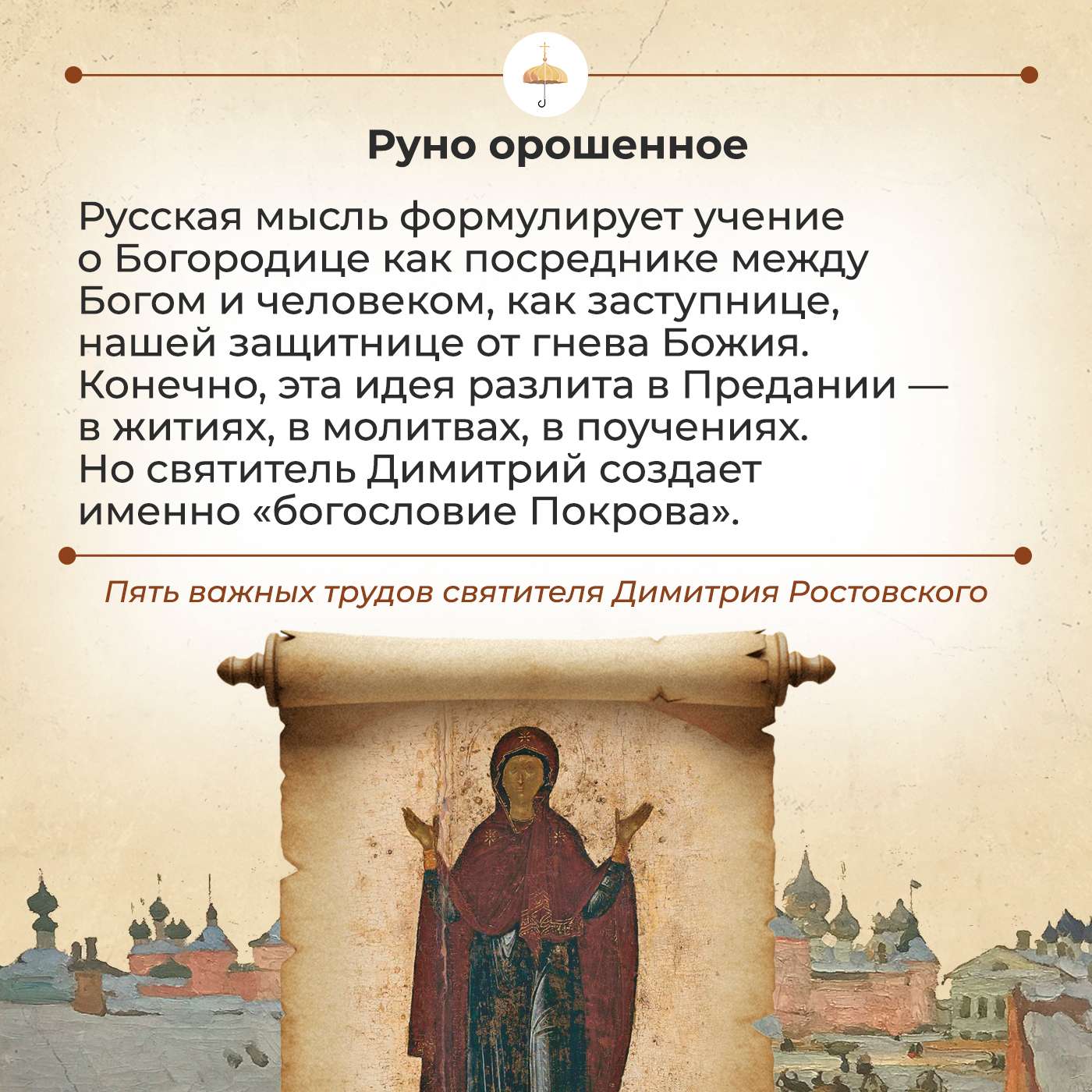 Почти сразу святитель Димитрий выпустил переработанный вариант книги под названием «Руно орошенное»: количество чудес увеличивается до 24, а нравоучения составляются заново. Сюжеты обеих книжек позже использовались в синодиках, народных картинках, иконографии — например, в богородичных образах «Нечаянная радость» и «Целительница». Но еще важнее то, что в этих текстах — сошлюсь на мнение протоиерея Павла Хондзинского — русская мысль формулирует учение о Богородице как посреднике между Богом и человеком, как заступнице, нашей защитнице от гнева Божия. Конечно, эта идея разлита в Предании — в житиях, в молитвах, в поучениях. Но святитель Димитрий создает именно «богословие Покрова».