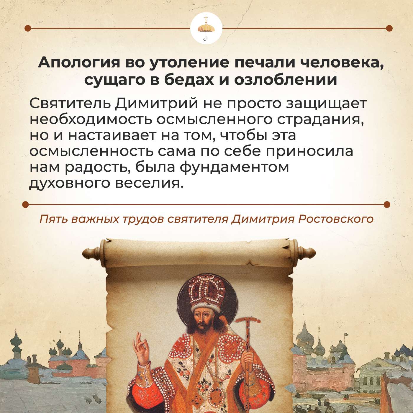Святитель Димитрий не просто защищает необходимость осмысленного страдания, но и настаивает на том, чтобы эта осмысленность сама по себе приносила нам радость, была фундаментом духовного веселия. Плач о грехах? Он возможен только как мгновенное осознание своего падения, вслед за которым должно прийти наслаждение божественным определением о тебе, даже если оно выражено в суровом наказании.