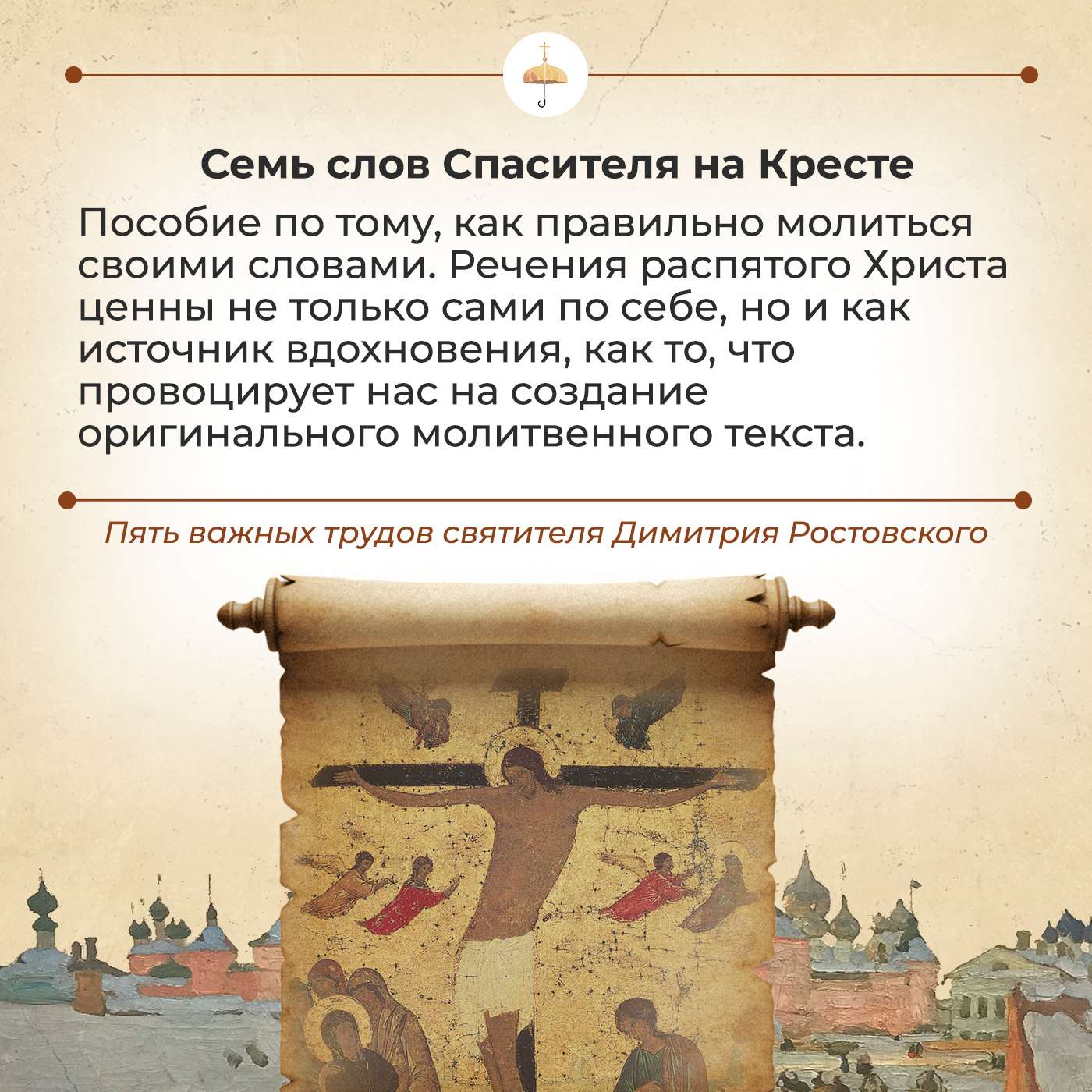 Традиция группировать голгофские речения Господа — по аналогии с семью таинствами или семью смертными грехами — и составлять по их мотивам медитации-размышления, родом, вероятно, из протестантской (а точнее, предреформационной) Германии начала XVI века. Эта традиция существовала и существует в музыкальном изводе — от составленного в 1537 году гимна Da Jesus an dem Kreuze stund Йохана Бешенштейна до «Семи слов Христа» Софии Губайдулиной, и в изводе богословско-спекулятивном: скажем, всего через двадцать лет после кончины святителя Димитрия лютеранский богослов Иоанн Яков Рамбах опубликовал огромный трактат «Рассмотрение всех страстей Христовых и о семи последних словах распятого Иисуса». Понятно, что гессенский профессор и ростовский архиерей, скорее всего, даже не подозревали о существовании друг друга, но принадлежали к одной и той же литературной традиции, которую мы пока еще плохо знаем — и саму по себе, и с точки зрения источников святителя Димитрия.