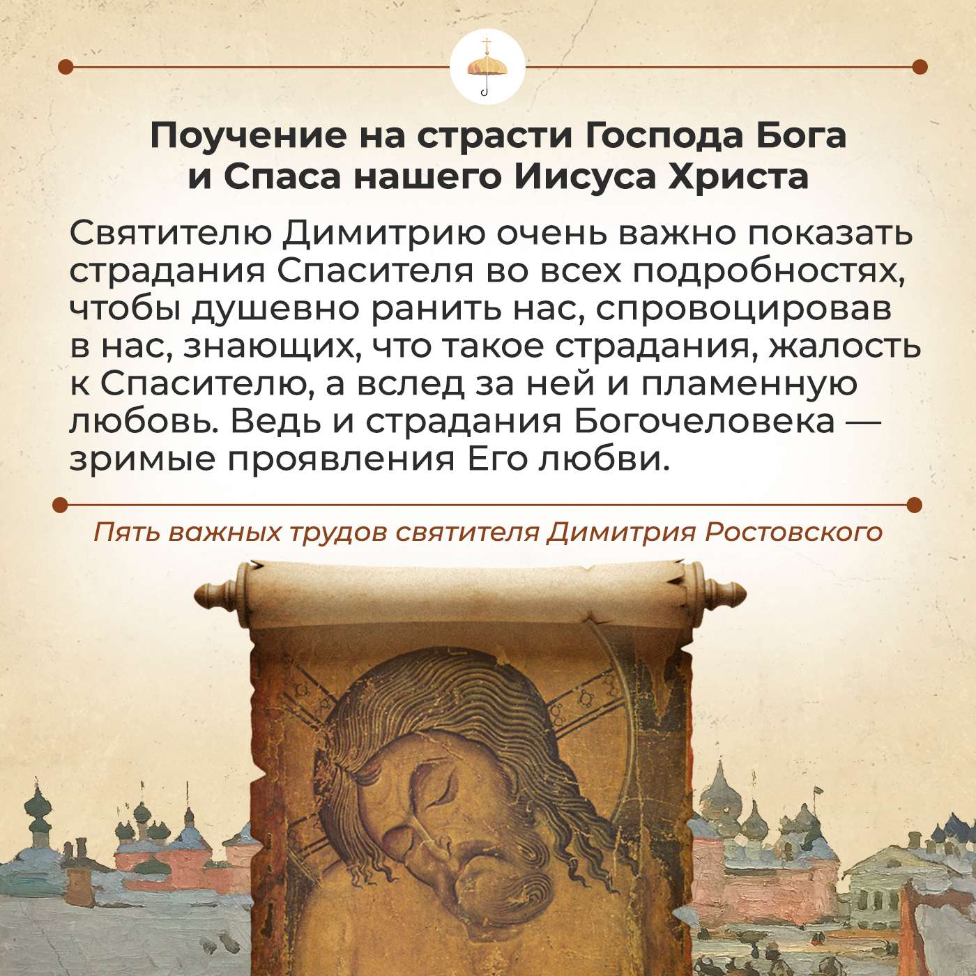 Святителю Димитрию Ростовскому очень важно показать страдания Спасителя во всех подробностях, чтобы душевно ранить нас, спровоцировав в нас, знающих, что такое страдания, жалость к Спасителю, а вслед за ней и пламенную любовь. Ведь и страдания Богочеловека — зримые проявления Его любви. Любовь Божия, выраженная в страданиях Сына, встречается с любовью человека, вызванной понятными нам Его страданиями.
