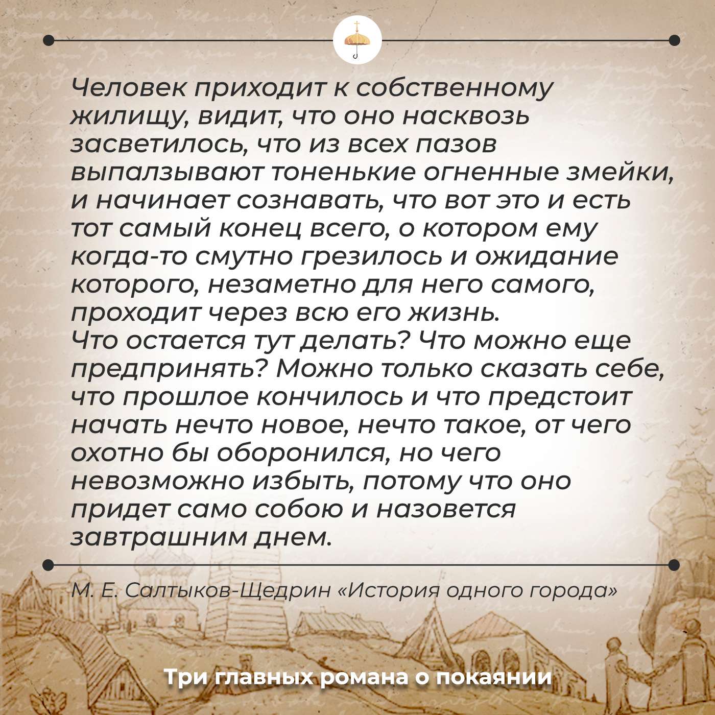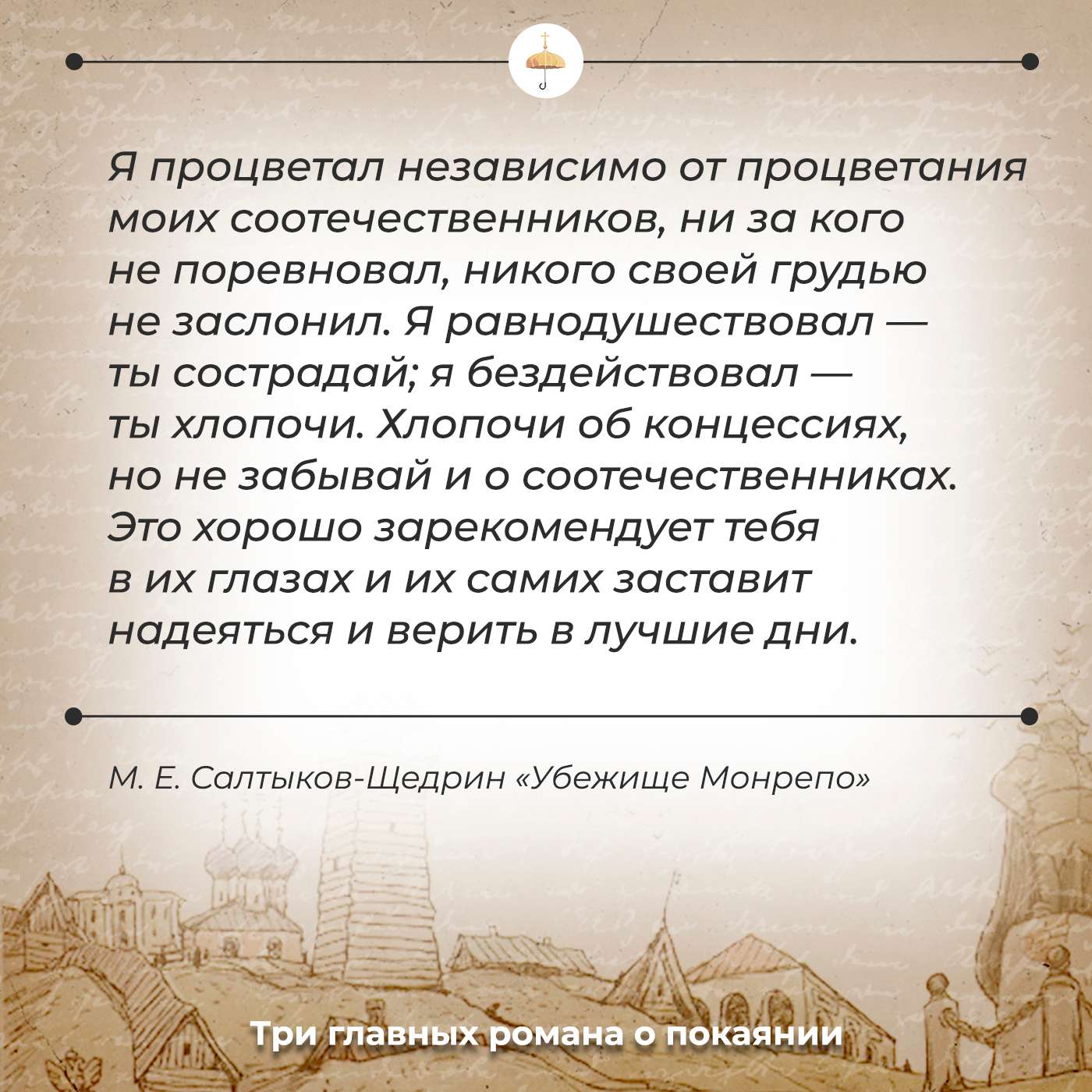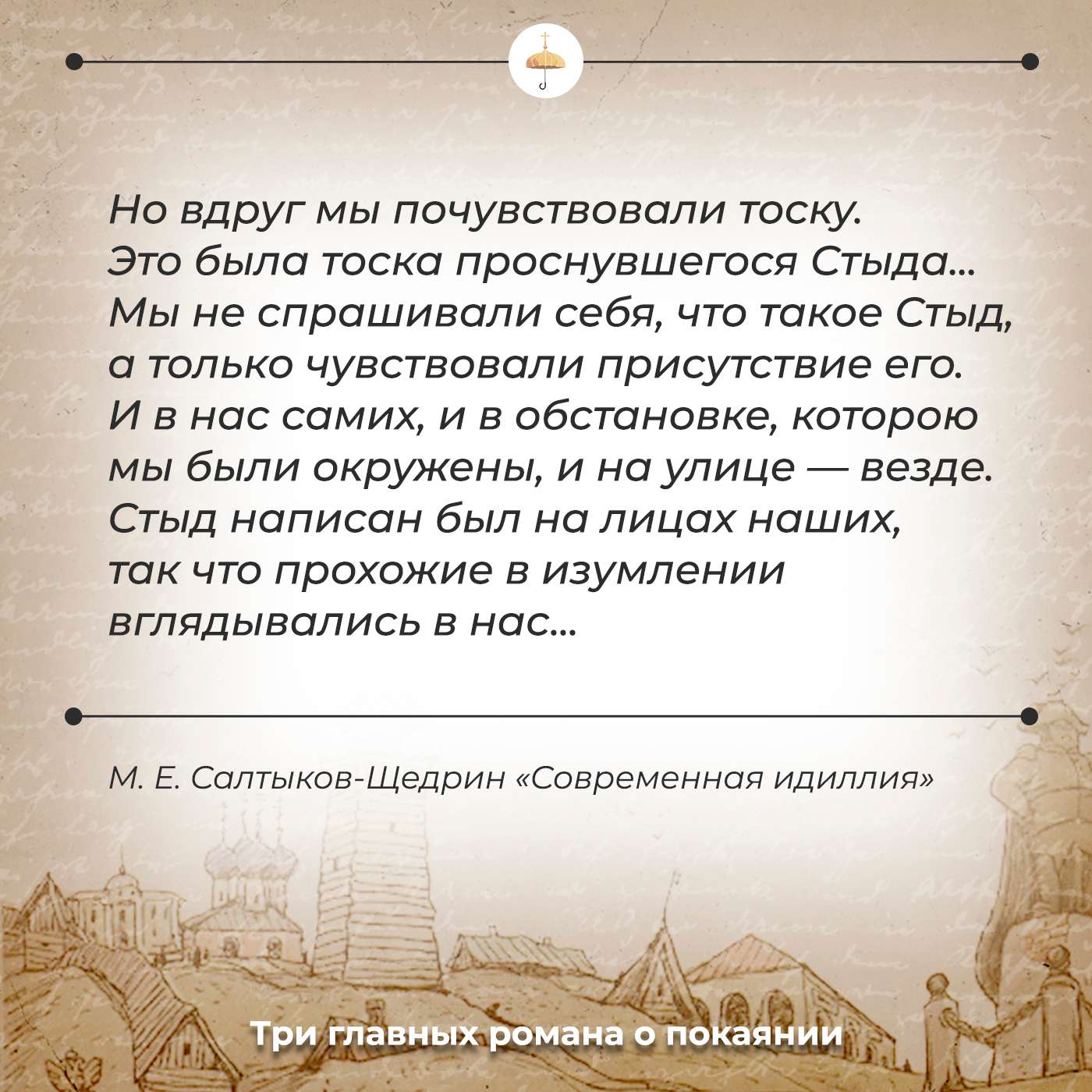 Русская литература неоднократно пыталась написать о покаянии, но раз за разом терпела неудачу. «Мертвые души», с этой точки зрения, — фиаско: писатель остановился на экспозиции грешника задолго до того, как тот задумал встать на путь света. В «Преступлении и наказании» дело представлено так, что читатель сам должен додумать, какие душевные трансформации произойдут с Раскольниковым на каторге. Роман о покаянии написал Салтыков-Щедрин. Вполне выдержав траекторию характера — от собирания камней греха к постепенному очерствению, через ад самообличения к предсмертному покаянию.