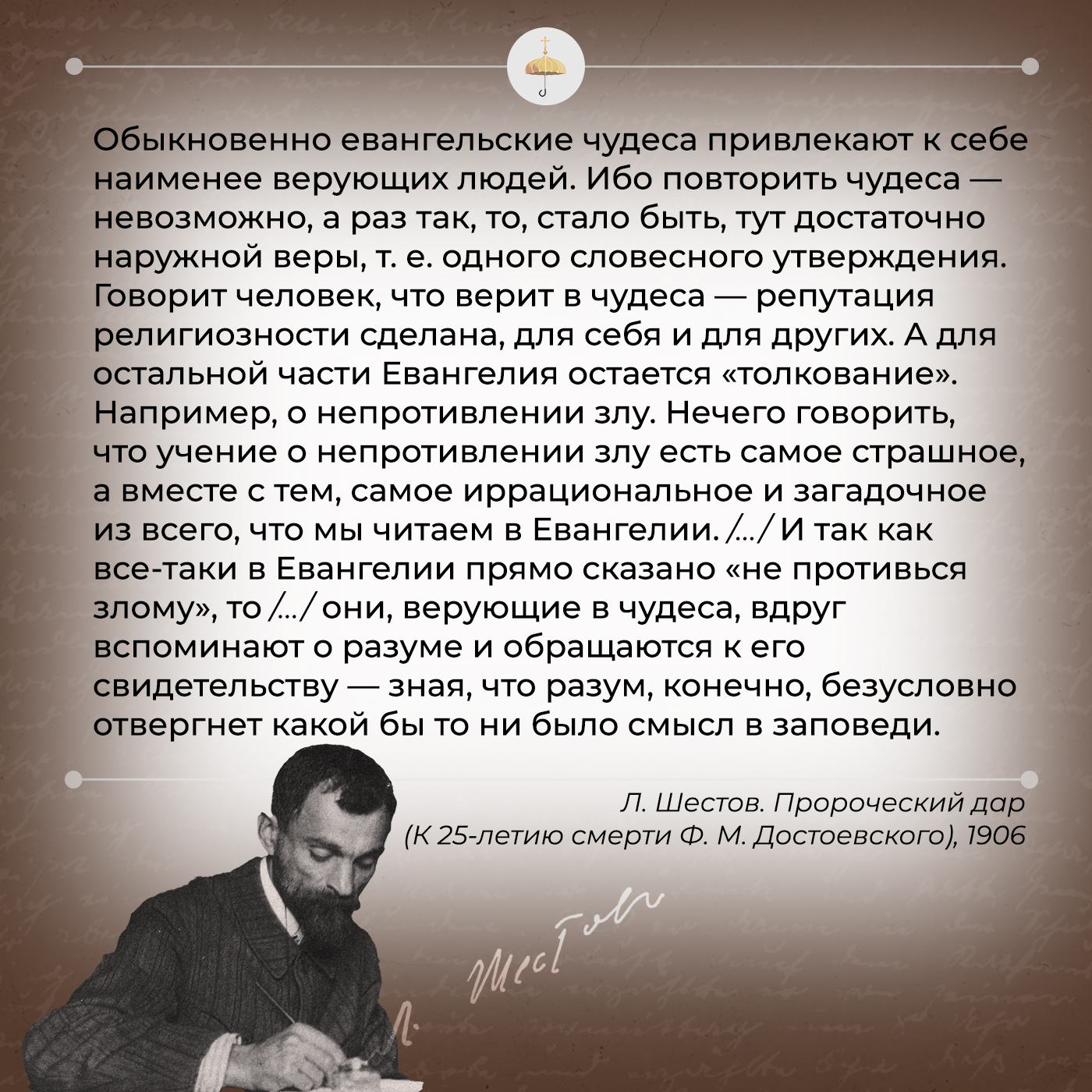 «Обыкновенно евангельские чудеса привлекают к себе наименее верующих людей. Ибо повторить чудеса — невозможно, а раз так, то, стало быть, тут достаточно наружной веры, т. е. одного словесного утверждения. Говорит человек, что верит в чудеса — репутация религиозности сделана, для себя и для других. А для остальной части Евангелия остается “толкование”. Например, о непротивлении злу. Нечего говорить, что учение о непротивлении злу есть самое страшное, а вместе с тем, самое иррациональное и загадочное из всего, что мы читаем в Евангелии. Все наше разумное существо возмущается при мысли, что злодею оставляется полная материальная свобода для совершения его злодейских дел. Как позволить разбойнику на твоих глазах убить неповинного ребенка и не обнажить меча?! Кто вправе, кто мог заповедать такое возмутительное предписание? /…/ И так как все-таки в Евангелии прямо сказано “не противься злому”, то /…/ они, верующие в чудеса, вдруг вспоминают о разуме и обращаются к его свидетельству — зная, что разум, конечно, безусловно отвергнет какой бы то ни было смысл в заповеди. Иначе говоря, они повторяют о Христе слова сомневавшихся евреев: кто Он такой, что говорит, как власть имеющий? /…/ как только требования Христа не встречают оправдания в их разуме, отказываются исполнять их. А говорят, что веруют и в воскресение Лазаря, и в излечение паралитиков, и во все прочее, о чем повествуют апостолы. Почему же их вера оканчивается как раз там, где она начинает обязывать? /…/ Кто Он такой, что говорил, как власть имеющий? Нельзя ныне проверить, точно ли Он воскресил Лазаря и насытил несколькими хлебами тысячную толпу. Но, исполнив без колебания Его заповеди, можно узнать, дал ли Он нам истину…»