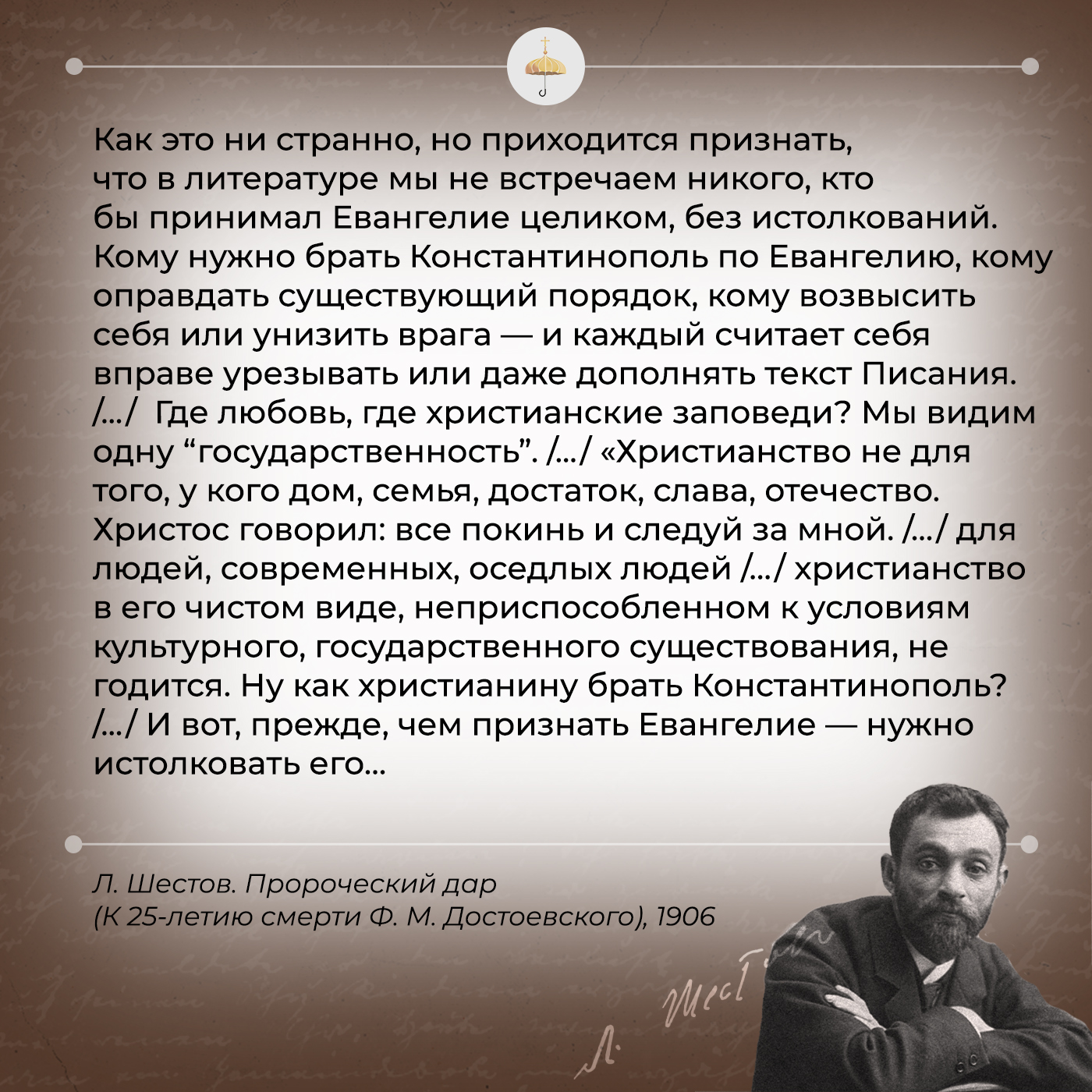 «Как это ни странно, но приходится признать, что в литературе мы не встречаем никого, кто бы принимал Евангелие целиком, без истолкований. Кому нужно брать Константинополь по Евангелию, кому оправдать существующий порядок, кому возвысить себя или унизить врага — и каждый считает себя вправе урезывать или даже дополнять текст Писания».