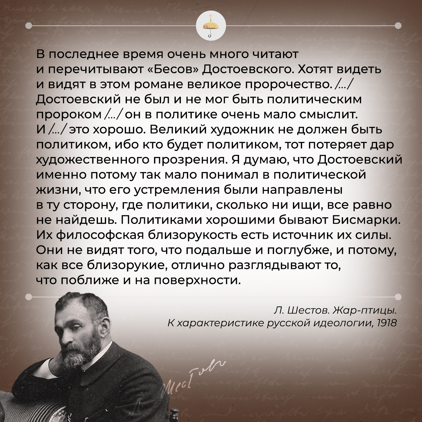 «В последнее время очень много читают и перечитывают «Бесов» Достоевского. Хотят видеть и видят в этом романе великое пророчество. /…/ Достоевский не был и не мог быть политическим пророком /…/ он в политике очень мало смыслит. И что это хорошо. Великий художник не должен быть политиком, ибо кто будет политиком, тот потеряет дар художественного прозрения. Я думаю, что Достоевский именно потому так мало понимал в политической жизни, что его устремления были направлены в ту сторону, где политики, сколько ни ищи, все равно не найдешь. Политиками хорошими бывают Бисмарки. Их философская близорукость есть источник их силы. Они не видят того, что подальше и поглубже, и потому, как все близорукие, отлично разглядывают то, что поближе и на поверхности. И, если нужны новые доказательства того, что Достоевский был плохим политиком, если «Дневник писателя», в котором так много пророчествуется на тему о том, что Россия, в противуположность Европе, разрешит мирным путем, без всяких столкновений, все сложные и запутанные вопросы социального порядка, еще не всех убедил, как мало умел он понимать, что ждет нашу страну в очень близком будущем, то, пожалуй /…/ слова его из «Дневника писателя» даже без всяких комментариев покажут и наиболее упрямым поклонникам пророческого дара Достоевского, что у него менее, чем у кого-либо другого из великих русских писателей, можно искать и находить поучения и разъяснения на тему о текущих событиях».