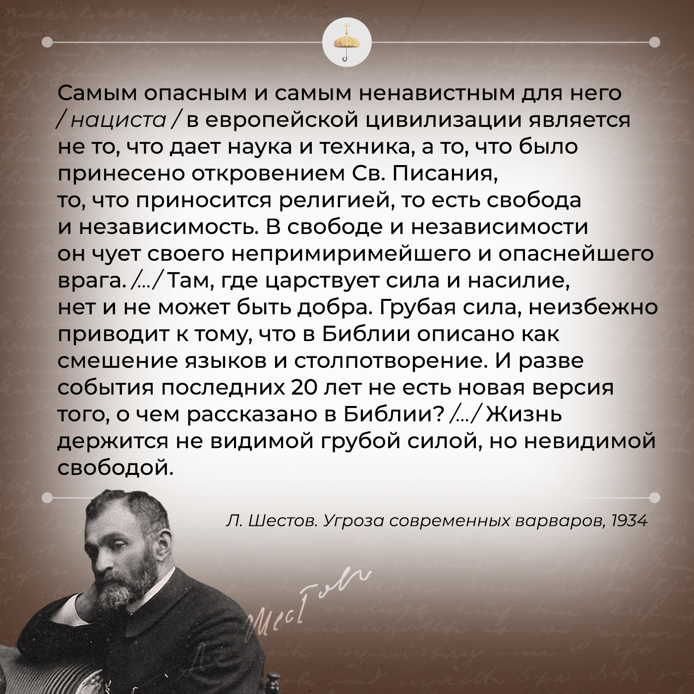 «На технические и научные завоевания [неоварвар Мировых войн и тоталитаризмов] не посягает, правильно чувствуя, что ни наука, ни техника сами по себе ему не враждебны, что они, наоборот, скорее всего могут явиться для него наиболее надежными и верными союзниками. Самым опасным и самым ненавистным для него в европейской цивилизации является не то, что дает наука и техника, а то, что было принесено откровением Св. Писания, то, что приносится религией, то есть свобода и независимость. В свободе и независимости он чует своего непримиримейшего и опаснейшего врага. Всю силу свою он направляет к тому, чтобы раз и навсегда окончательно раздавить свободу. И тут мы подошли к ответу на поставленный вопрос: что нужно спасать в современной цивилизации. Нужно спасать то, чему больше всего угрожают, ибо угрожают тому, что больше всего ценно в ней. Нужно спасать свободу. Люди должны собрать все силы свои к тому, чтобы остановить вторжение варваров в их жизнь и варварства в их души. Удачи их не должны пугать нас. Их победы даже свидетельствуют об их неспособности ответить на элементарные нужды людей. Там, где царствует сила и насилие, нет и не может быть добра. Грубая сила, неизбежно приводит к тому, что в Библии описано как смешение языков и столпотворение. И разве события последних 20 лет не есть новая версия того, о чем рассказано в Библии?»