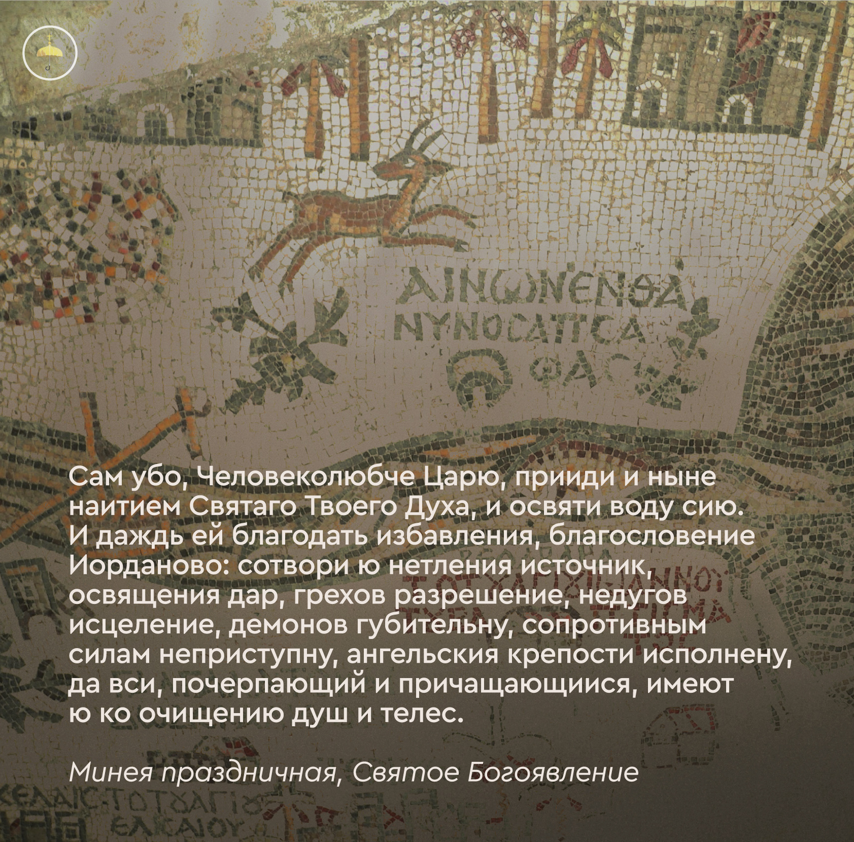 «Сам убо, Человеколюбче Царю, прииди и ныне наитием Святаго Твоего Духа, и освяти воду сию. И даждь ей благодать избавления, благословение Иорданово: сотвори ю нетления источник, освящения дар, грехов разрешение, недугов исцеление, демонов губительну, сопротивным силам неприступну, ангельския крепости исполнену, да вси, почерпающий и причащающиися, имеют ю ко очищению душ и телес» (Минея праздничная, Святое Богоявление).