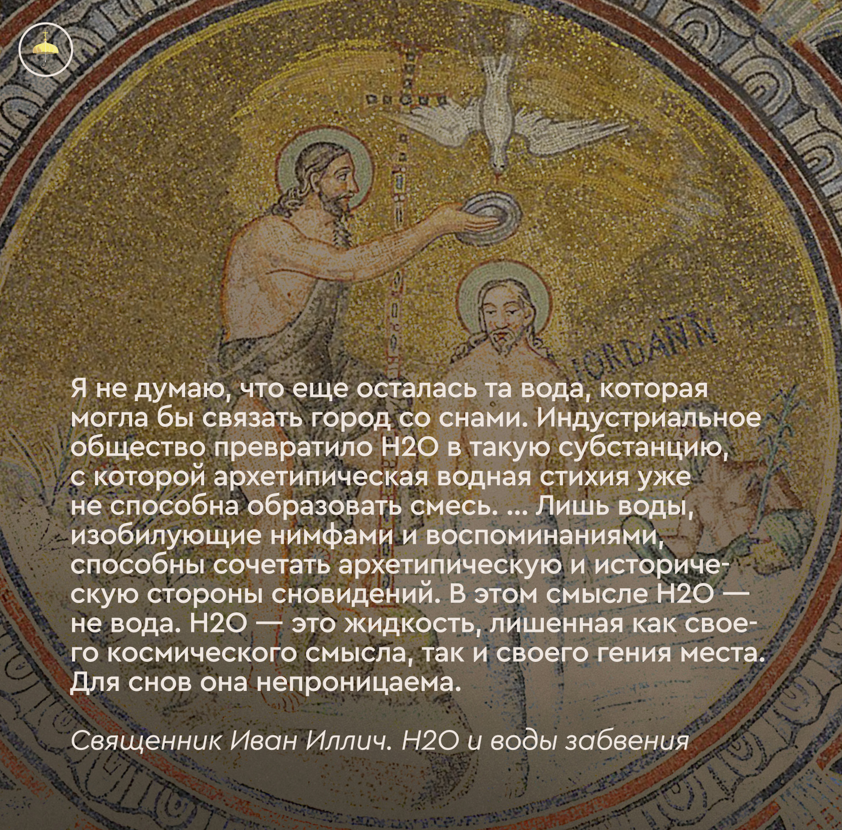 Поздней современности, позднему индустриализму тем самым нужно великое водосвятие, обретение в H2O — Великой агиасмы. За бесконечным обсуждением «крещенских окунаний», (глупейшим) недоумением «святой водой» и т. п. мы все пропускаем спасительные целительные социально-психологические смысл и ценность «святой воды». Как раз радикальная критическая теория (Иллич) могла бы помочь понять нам смысл и ценность Великого водосвятия: оно могло бы как раз вернуть космический смысл, архетипические, символические глубины мировым водам; они снова могли бы стать материей наших снов, грез.