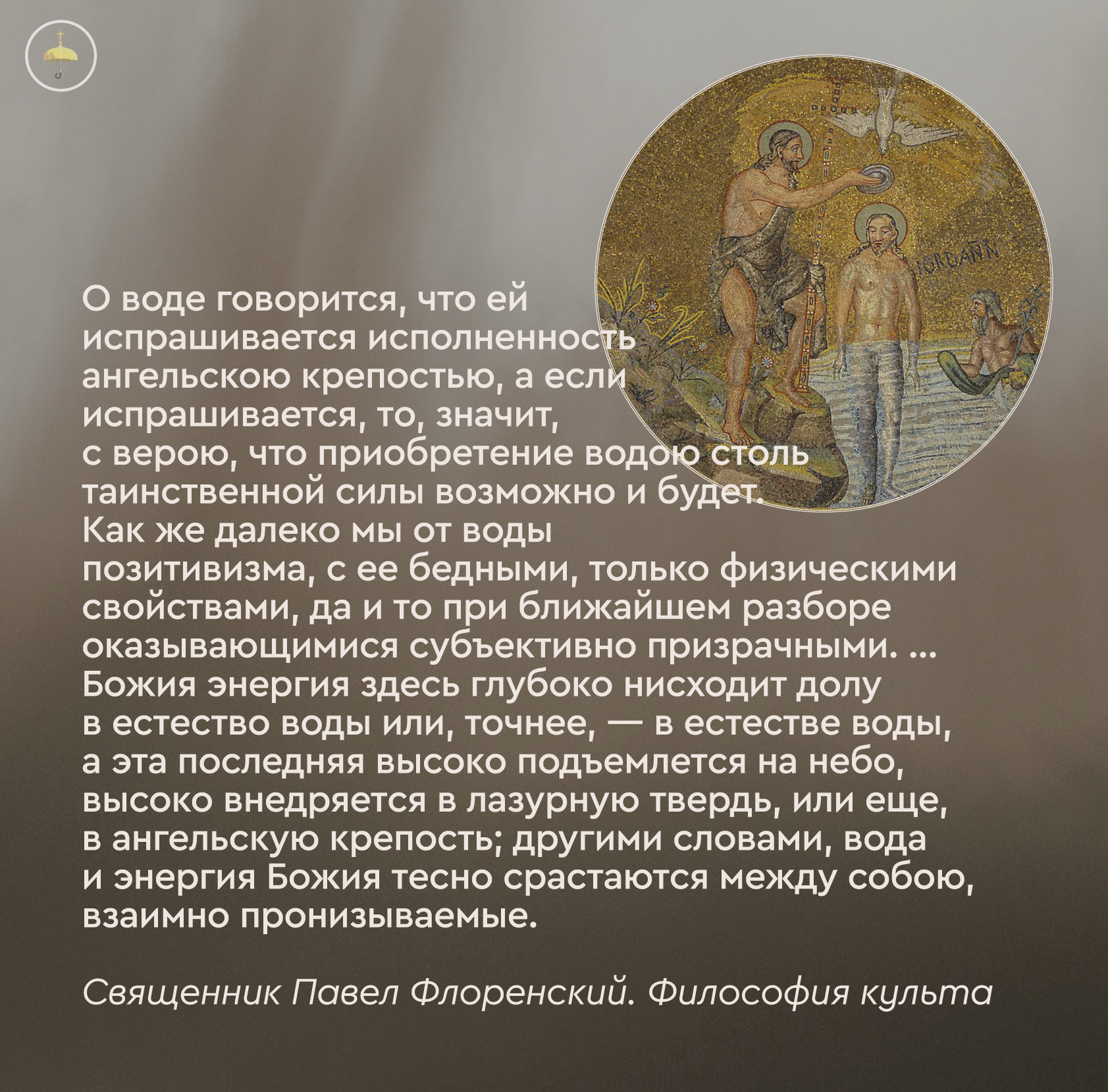 В «Философии культа» священника Павла Флоренского, классика русской религиозной философии — в этой поразительной, прекрасной попытке подойти к обрядам и таинства Церкви с философской стороны и более, радикально: ориентировать современную философию на культ, найти в церковном богослужении эвристические ресурсы, темы и ходы для современной мысли — в этой книге мы находим большой кусок, посвященный воде вообще и богоявленской воде в частности. Книга Флоренского носит ярко «илличианский» характер, а именно стихии мира, деятельности людей здесь высвобождаются из-под тягла «полезности», горизонта понимания индустриальной цивилизации — как таковые способные к участию в таинствах Церкви, к соединению с Божественными энергиями. Мир, воды мира не как сырье, ресурсы, материалы для человеческой эксплуатации: такой мир возвращает нам Великое водосвятие, этот, по Флоренскому, вызов утилитаризму и позитивизму. Мир — место смысла и святости, божественных энергий и ангелов, а не утилитарного пользования. Отметим здесь среди прочего, что богослужение Церкви включает в себя и общечеловеческое, «магическое» переживание воды — тем сохраняя его для нас, утративших его. Есть ангелы вод.