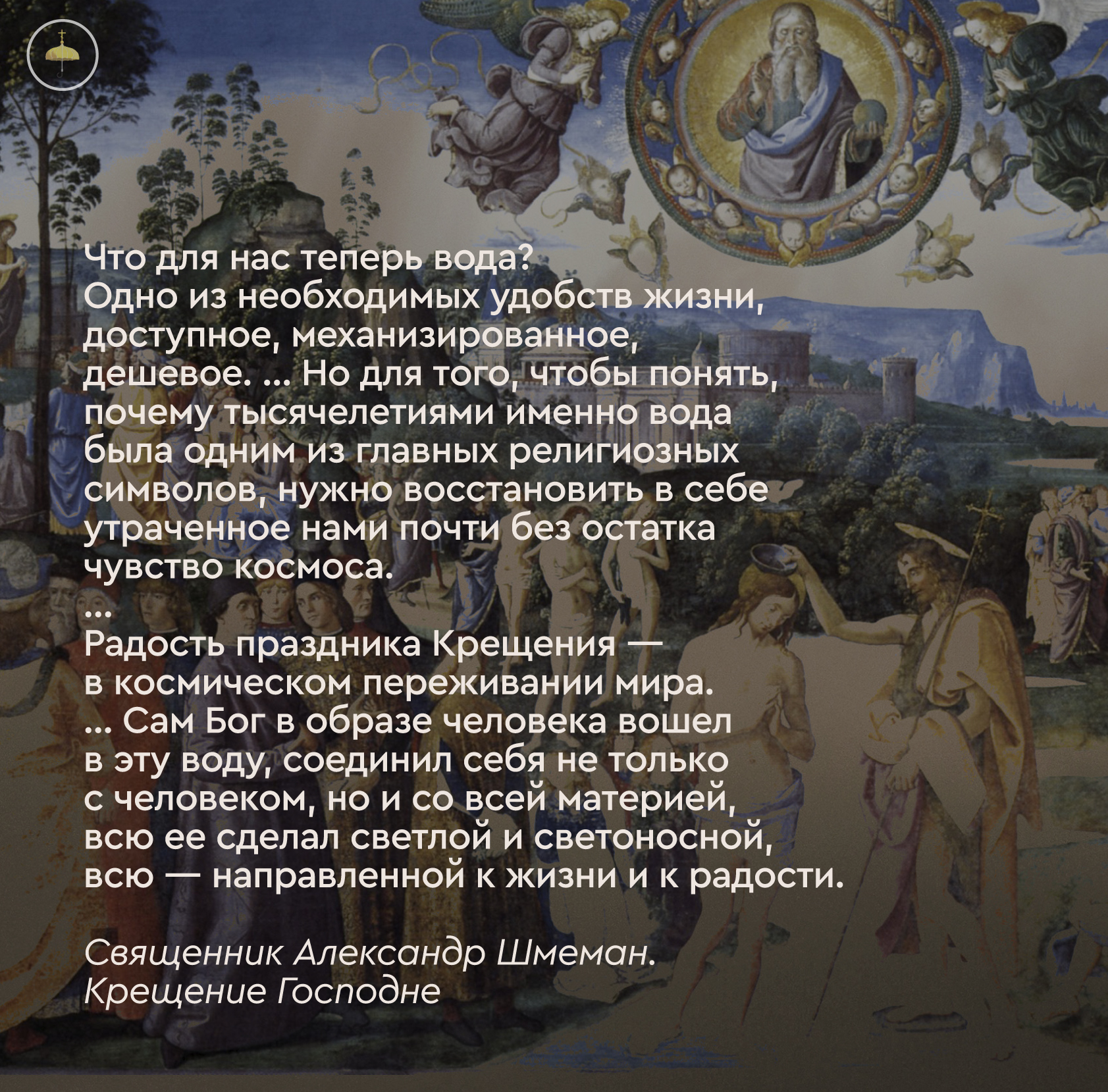 «Что для нас теперь вода? Одно из необходимых удобств жизни, доступное, механизированное, дешевое. Открыли кран, и вот она бежит… Но для того, чтобы понять, почему тысячелетиями именно вода была одним из главных религиозных символов, нужно восстановить в себе утраченное нами почти без остатка чувство космоса. … Радость праздника Крещения — в космическом переживании мира».